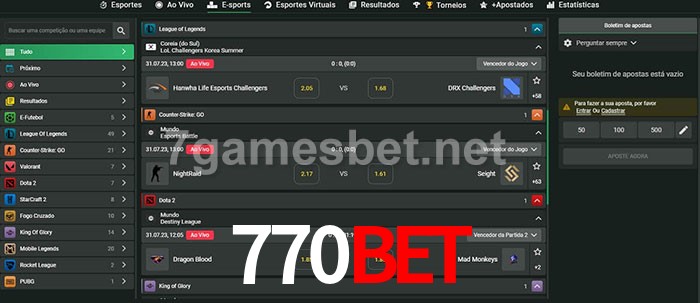 O 770Bet oferece uma grande seleção de opções de apostas em e-sports com probabilidades competitivas